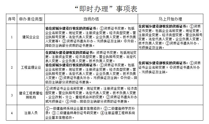 为进一步推进服务型机关建设,提升办事效率,更好地服务建筑企业,现将部分事项推行“即时办理”,有关事宜通知如下: