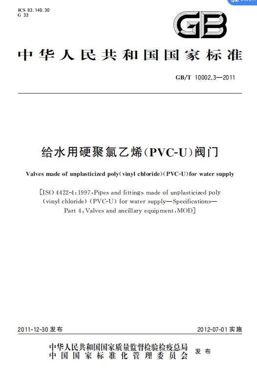 GB/T 10002.3-2011 给水用硬聚氯乙烯(PVC-U)阀门
