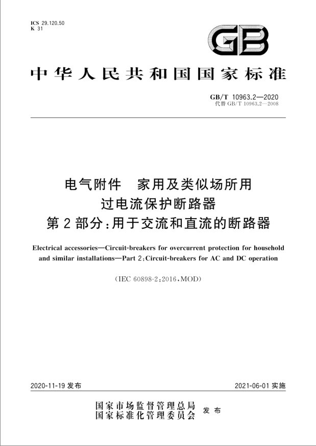 电气附件 家用及类似场所用过电流保护断路器 第2部分:用于交流和直流的断路器 GB/T 10963.2-2020
