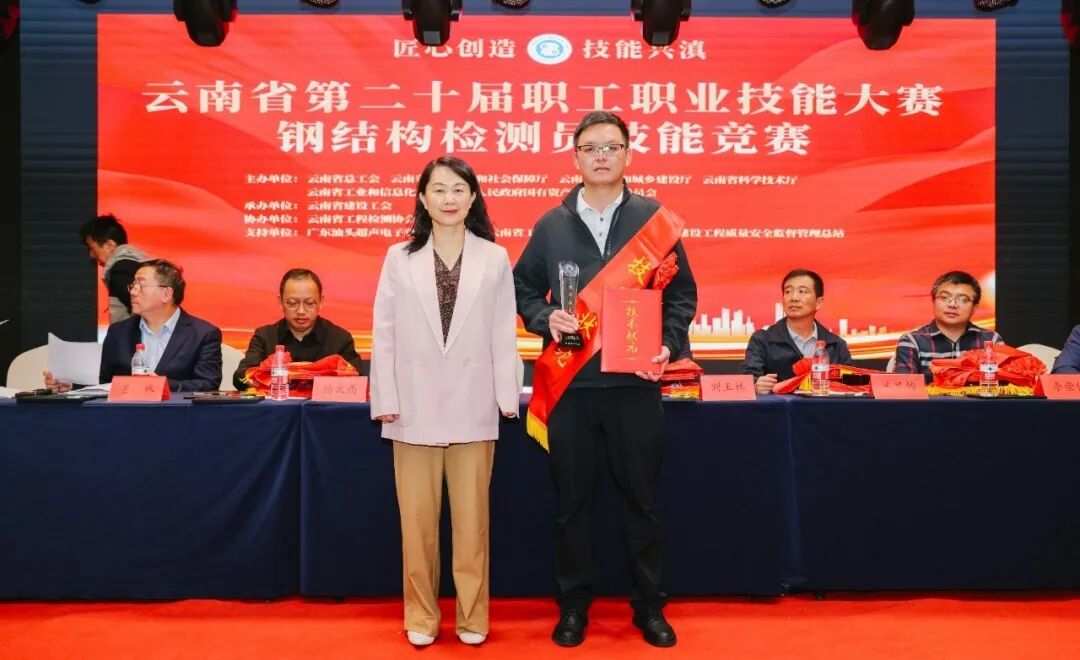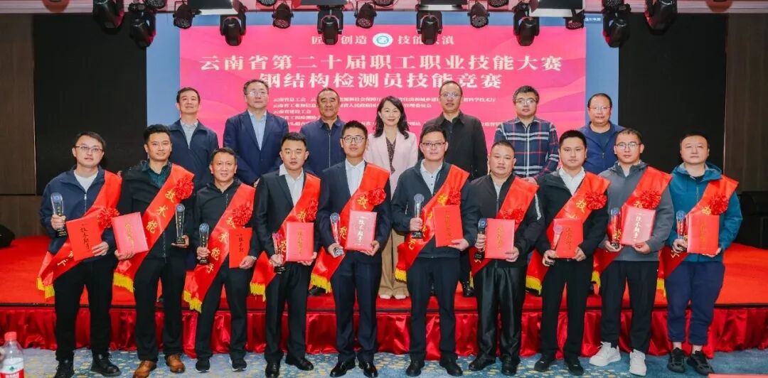 随后,省住建厅行政审批处张咏梅处长、省质监站杨太高站长、省住建厅质安处刘玉林调研员、省住建厅建管处潘昱锦主任科员、昆明市质安总站李崇伟主任共同为云南省第二十届职工职业技能大赛钢结构检测员技能竞赛获奖选手颁奖。云南利光检测有限公司陶则旭荣获“技术状元”称号,国检测试控股集团云南有限公司张勇等9名选手获评“技术能手”。