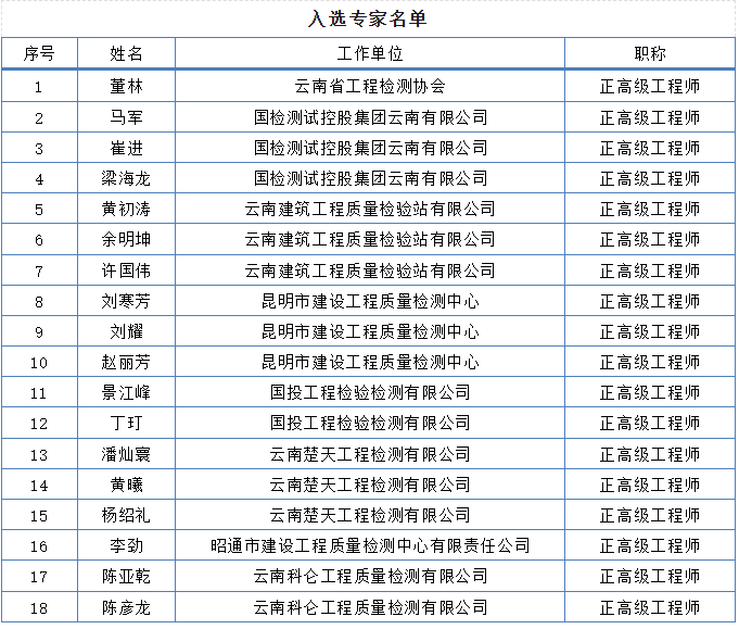 入库专家不仅要具备深厚的理论基础和丰富的工程实践经验,还要具备扎实的政治素养和高尚的职业操守,在行业内享有较高的声誉与影响力。经过中国建筑业协会质量管理与监督检测分会的严格审核,云南省共有18名工程质量检测专家入选。